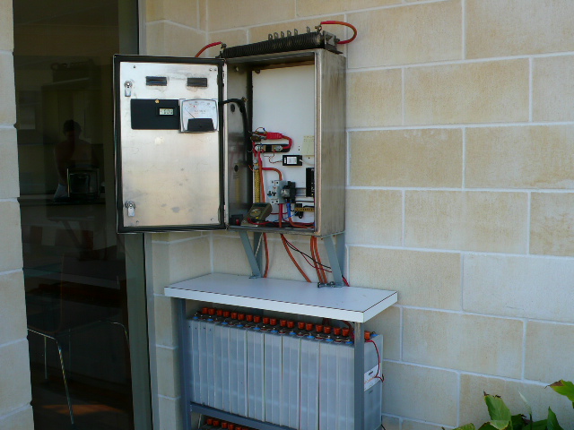 Thanks for your comments , the plasmatronics pl20 is very good it controlls the dump load via the relay on the rail which then switches 2 24v larger relays in series , I have had a fair bit of trouble with burning out contacts in relays when the dump load switches of , I have overcome this at present buy removing the back contacts to give more air gap . The other good thing with the pl20 is it loggs data , total amp hours for the day and stores last 30 days data , if you go to www.plasmatronics you can down load the manual etc . The red thing is a length of 1/4 unc rod bent in a u , covered in heat shrink is being used as a shunt for the amps & watts meters . The wind gen is gradually getting more power output as I am modifying the blades and their angles , I had a peak of 9 amps at 63v into the batts the other day . At present I have just completed 2 Neo rotors which will go on in a couple of days when I get home ,on tests I have done up here on an unmodified stator they should give a 40~50% power increase , hopefully this will load the blades more as they don't seem to have any effort spinning the standard dual. I've decided to go down the path of increasing the field strength as you do in normal alts to get more power and up the power going in and with better blade profiles etc to get the power to the input , simple logic: you can't drive a mac truck with a mower engine.!! Anyway thought I'd repily and have have a bit of a rave on what I've been doing.. The bricks are sandstone look a likes made by Gympie Bricks outside Brisbane , heaps cheaper than the real deal