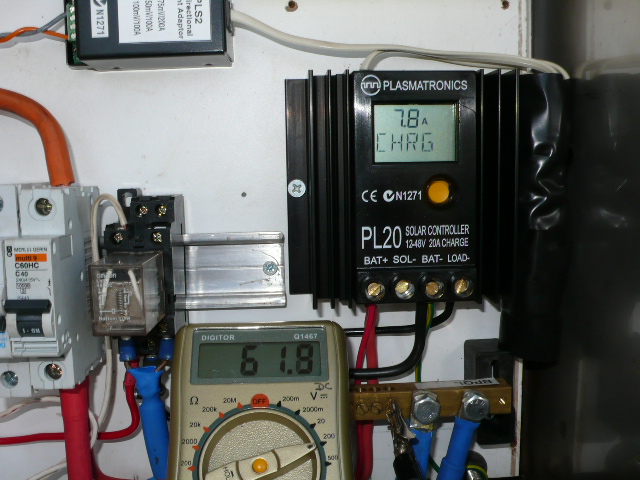 Plasmatronics pl 20 controlls the dump load and logs how many amp hrs goes in over a 24hr period . It loged 21 amp hours a few days ago we had good constant wind and storms . Saw the amps hit 8.9 @ 62 Vlts in 40 klm and the wind went to 60 but the star delta relay wire was disconnected and it defaults to star so the amps sat solid on 5.6...
