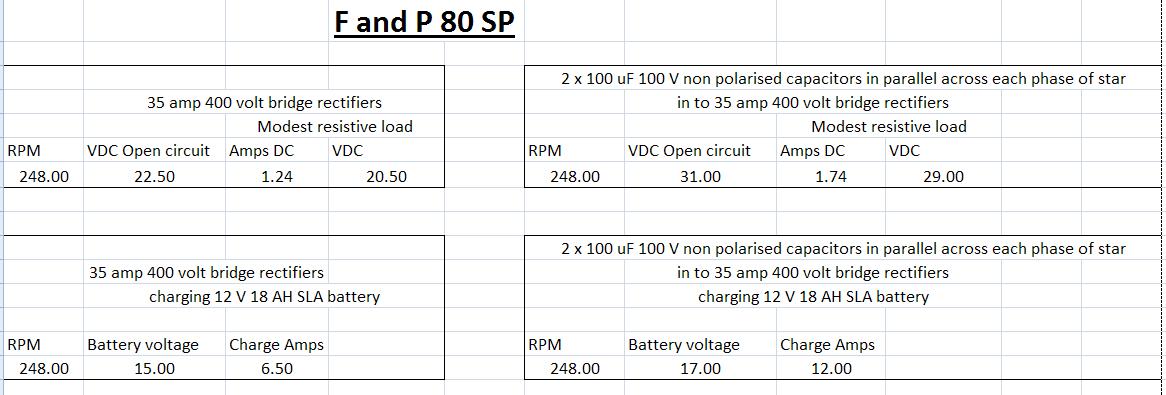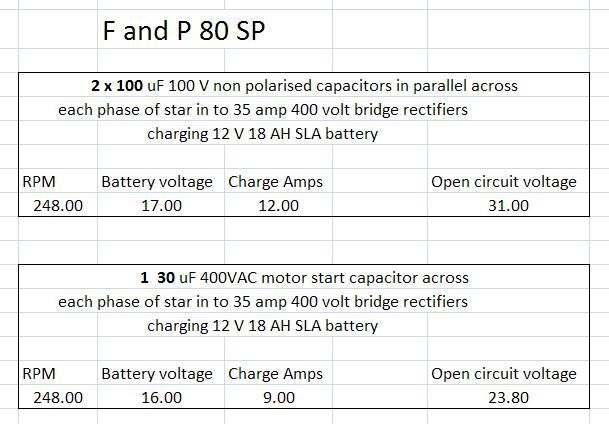 The MFD of the 3 unpolorised Caps we use has not been tied down and it appears that 60 MFD to 140 MFD work just as well . We use a 80 SP in Star Output. That is 3 AC wires out which have the 3 caps connected across each one of them phase to phase. We get a genuine doubling of Amps out with a very slight decrease in RPM . It is very difficult to determine if Our 5 blade Piggott notices capaciters within its operating RPM . The test bench 240 Volt Motor doesnt seem to notice it either with no increase in load amps Getting 3 Amps at 26 volts where you might have got nothing is easily achieved. Equally turning 6 Amps into 12Amps is simple.At a higher speed 10 Amps turns into 20 Amps with our Bridge Rectifiers getting hot.It defies logic why this system works so well and if there is any trade off and it is very hard to measure.Using Caps with other F and Ps will work but they will need to be matched to each unit which we will do when time permits .