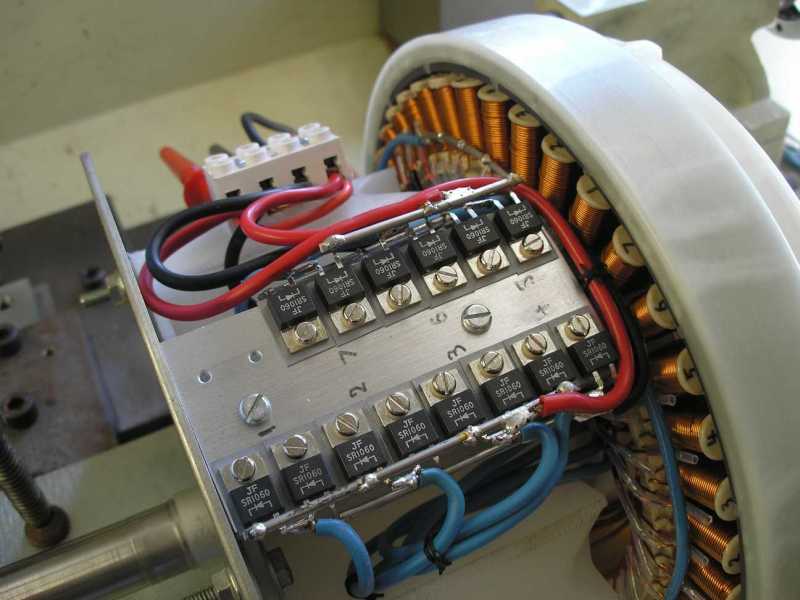 I used a bank of 14 Schottky diodes from Oatley for the rectifier. They are $1.- each and are rated 10A/60V. The short alu channel they were mounted on only got warm to the touch when I ran it for a while, delivering about 300W into the fan cooled resistor load.