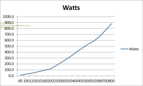 For those interested that are not sure how to interpret the table above, I've made a graph from that same data showing it's optimum operating output. As stated above I used a 36 pole stator wired in Delta mode uncut with a black rotor cap into a 86 ohm load. Horizontal axis is RPM.