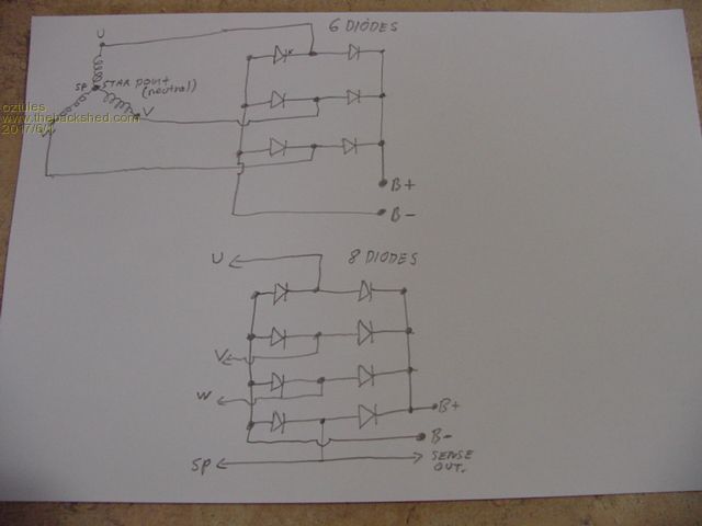 Star delta switching should be very simple with these alternators. We have the situation where shorting the windings will have no deleterious effect on the wiring due to the inductive reactance... and here it gets interesting. This shares the same characteristics with car alternators in that respect, so it is not unreasonable to find that the addition of two diode only will allow for automatic star delta switching.. totally seamless and no electronics in sight. So this can be added to any star connected mill, provided you can access the star point. The diodes will go from star point to the pos and neg rails... like in this pic from my playing with alternators story. http://www.anotherpower.com/board/index.php/topic,492.0.html Quite a few of the high power alternators use this now, it relies on the emf of the star combination falling below the delta combination. This will occur naturally, and normally you will see current limiting there, but now with the two diodes added, we will increase the current as the rpm increases until the new delta current limit is reached...... fiendishly simple, and i don;t have a unit to test it on, but if it works for car alts, it will certainly work for these long salient poled devices. ............oztules Village idiot...or... just another hack out of his depth |
