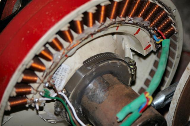 Here is what it should look like when finished! Notice that I have used hose clips around the lugs of the stator as the resin does not stick to the stator which I think is a good thing as it enables me to change the stator easily. (Dont be distracted by the cut-away stator, thats part of another story!