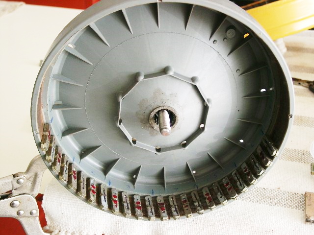 A very messy and time consuming task,as I had to clean all the magnets of their polyester resin from a previous failed attempt.. Sore fingers also,lining them up on a slight angle to reduce cogging .
