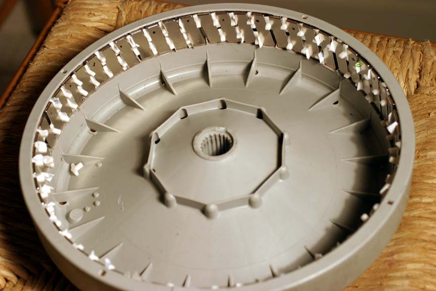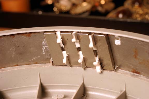 Re sealing magnets, has anybody tried this idea: Magnets assembled as in picture above. Hub mounted on horizontal shaft so that the shaft can be driven to rotate slowly via variable speed control. Spacers are removed and hub spun up. Resin is dripped on the spinning magnets. It will evenly disperse outwards by centrifugal force, no dam is required if there is still a lip on the open side of the hub. Keep spinning until the resin has set. I have not tried that with magnets but on some other job and it worked well enough as long as the rotating speed was fast enough to stop the resin running to the lower end. Tinker Klaus |