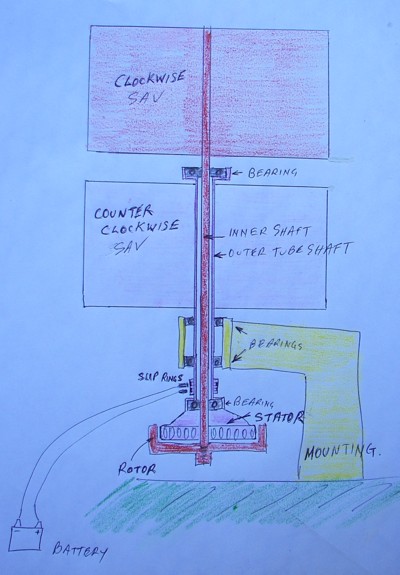 Here is an idea I picked off another Forum (FieldLines). It is quite good so I thought to pass it on here. The idea is to have two counter rotating savs. One driving the stator and the other driving the rotor. It doubles the speed of the generator without the power loss of a gearbox or other power loosing transmission. OK. So there is the losses of 4 bearings instead of 2, but that's bloody good for such an increase in gen speed. What's more this setup is easy to mount an F&P on to and would be about right for a 2 x 200 litre drum rig. Here's a sketch of how I see it: