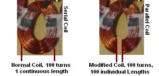 I like the Idea of the Dual-Rotor Axial Flux Alternator(DRAFA). I believe that is what I'm after. Some folks have had good results with it. These folks here made a DRAFA for their steam engine, which they say was almost exactly the same as the one they build for their Windmill, except for the way the coils were wound.Duel-Rotor Axial Flux Alternator otherpower.com group Something they said got me thinking about something. "The stator is identical to those we build for larger 17' diameter wind turbines with the exception...and wound the coils a bit differently. These coils are wound with 4 strands of #15 gauge wire (equivalent to 9 gauge wire) and there are 40 turns per coil." What came to mind was when a coil is wound with smaller gage wire, it produces more power but there is more resistance and heat losses and a limit to the amps a given coil can carry without fusing. So.. My question is... if a coil was wound with small gage wire with many turns, then cut through all the wires at one end where the magnet's flux doesn't pass, and connect all the ends together, would this solve the problem of resistance and let a higher amperage to be carried over many parallel single loop coils? Here's a pic.. Using the coil on the left for example is a normal coil, but it is really just many single windings all hooked in series, so I will refer to it as a serial coil. The one on the right has been cut at one end and as in the picture has had the ends wired together so that all the single loops are wired in parallel. So what I am thinking is that the coils in a stator can be wound with many turns of fine wire without worry of amps burning out the wire because there is very little resistance in a 1 loop wire. what, maybe a 5 inch loop? Now that I fried my brains thinking this up, tell me what you think. Brian VAWTs Up Doc? VAWTs Happening? Is that VAWT you vant? VAWT vere you thinking? |