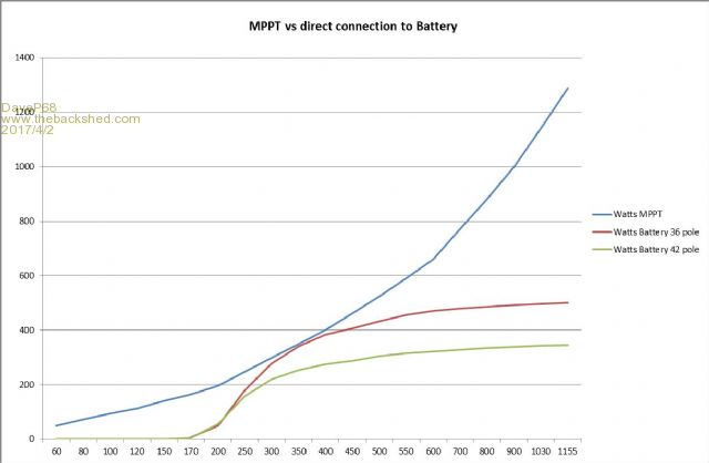 I have seen quotes on this site that state that you can't get anymore than 400 W from a single stator. This is the reason why that limit is always reached when directly connected to a battery. Please refer to the graph below showing correct load matching (MPPT) vs direct connection to a battery.