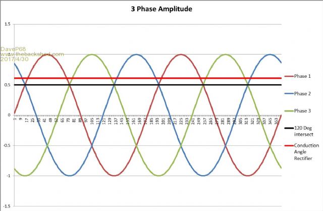 Another way to see how the capacitor doublers can extract more power is by looking at the conduction angle of the rectifiers on a 3 phase AC waveform.