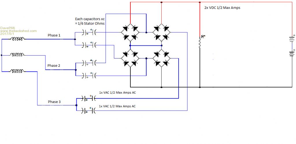 Here is a modified circuit of what Gordon came up with labeled with what the Volts and Currents are doing at maximum power output. Note how the Max AC current splits in half per phase into the 2x series 3 phase rectifier bridges.
