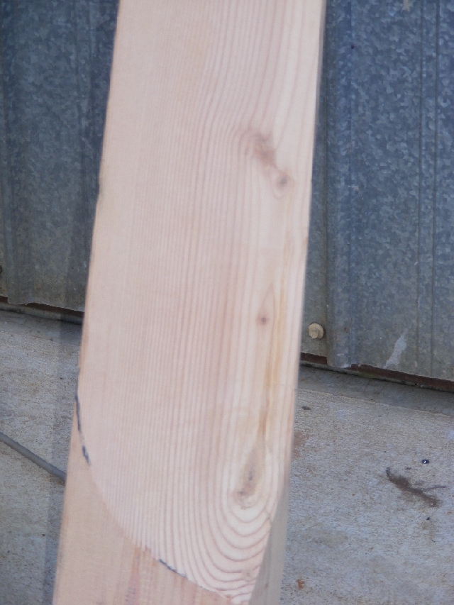 Hiya Guys, Well doing a Bruce and becoming a steptoe for a day we headed upto to the salvage yard where I got 3 decent oregon planks for some blades. Well Murphy is always around and it turned out on of the planks had a heap of knots so 3 hours of hand carving have gone to waste but better to be carefull I reckon. The pic's are of the the top side as I want to get all the angles true to Alton's Calc results then I'll carve the rear side once I'm happy all the angles are correct. this is a pic of the good blade straight grain no knots