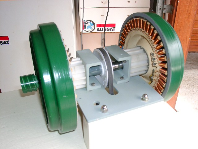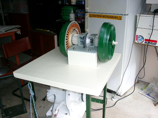 Hi Crew,, I've finally finished making a test bed for testing different re-wires of Stators and running up Neo Rotors .. I'll make an adaptor to fit the Seeley motor also -- With the gearbox (old floor polished) and 1.5 hp motor ,I get 400 rpm ..This can be changed by different pulleys .. Runs smooth ,just the normal gearbox noise..