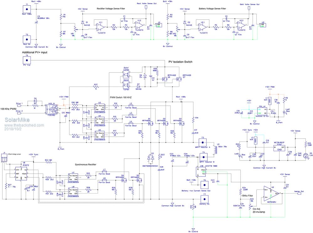 Then I thought why build just a battery charger, the circuit with a little modification could be turned into a MPPT PV charge controller if driven from a PV source by adding an extra mosfet PV isolation switch, this slow switch only has to turn on when charging, other times switched off to prevent the batteries discharging into the PV array. It is driven by opto-couplers that output a voltage at very low current but enough to switch a mosfet. No modular construction this time, the complete circuit fits on a 250x150mm double sided 2oz pcb. Using 80v rated input caps currently, their voltage could be increased to allow higher PV voltages. Schematic in progress below.
