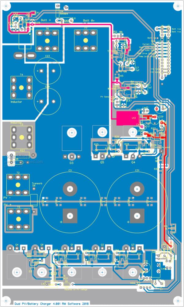 Finally completed PCB design, will make a prototype board over the next week or so and test it. Try on a low voltage 80v supply first, then unscrew the 2 input caps and replace with 200v versions to tryout as a PV controller. Power devices mount underneath the pcb bolted to a 5mm alloy panel that forms the rear of the case. The bottom of the pcb has mainly smd 1uf ceramic caps mounted around the main electrolytics.