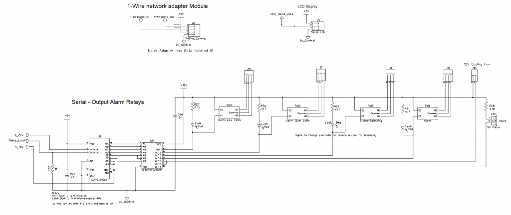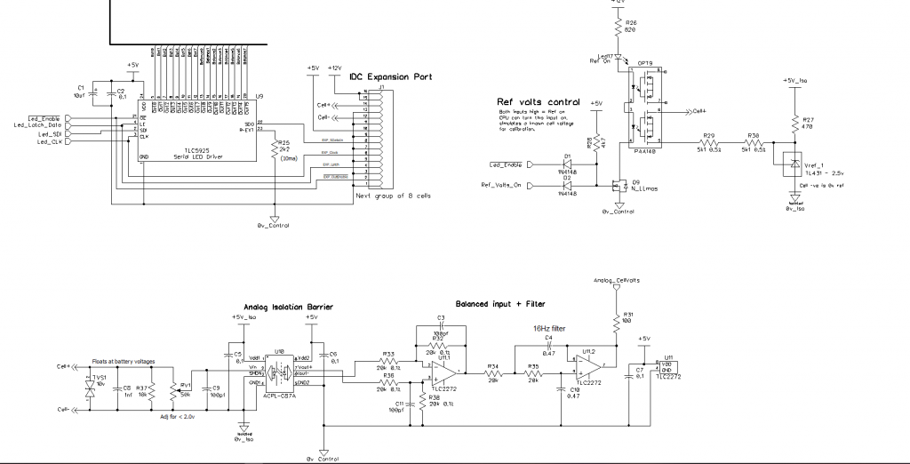 Changed the serial constant current LED driver chips to a better design that allows a higher than 5 volt source for the led drive. This ic TLC5925 has a high clock speed and can be connected to the standard CPU high speed SPI serial bus. 16 bits are clocked out per group of 8 cells; when voltages are read the loads are turned off, then clocked back on if required. Have arranged it so the serial bus can be extended in groups of 8 to accommodate bigger cell banks, cells can be 3 to 6 volts.