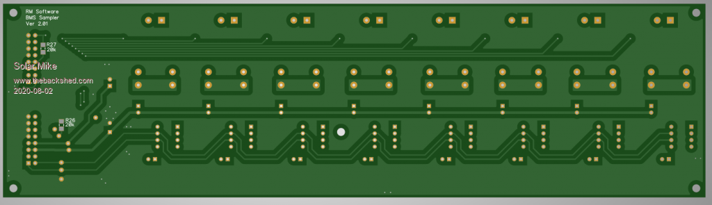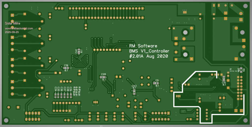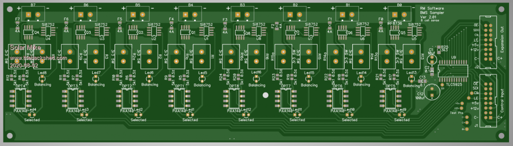 First cut of PCB, have allowed for connection to 8 battery cells per module; modules can be daisy chained to accommodate any number to make up the bank.