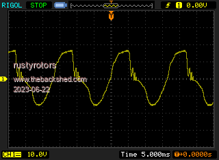 I connected the speed controller and turned it on, it puts a few spikes on the sinewave at irregular intervals, wound it up till the output was up to 1000w can see some ripple just after the peak of the sinewave, inverter was happy running with this but not sure for how long.