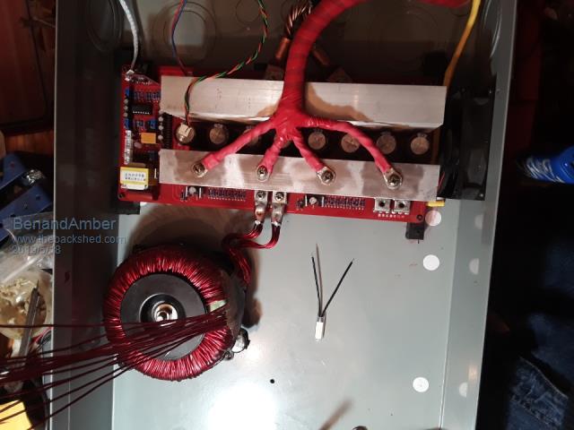 Completed inverter thoughts 200 amp breaker box is what I installed it in With over 50 lb Transformer this box ain't rigid enough When lifting it up the box bins diagonally Of course it'll be fine I'll have it mounted to a piece of plywood If I was going to do it over again I would find something more rigid Now to the inverter board itself If I had it to do over again I would get a board with no more than 16 mosfets Just my opinion but I think 24 is overkill and just ads more components to go bad or too fell There are eight capacitors on this board each capacitor is 1500 UF I think this is way too low of a value With the four mosfet little China board inverter I made (with the help of poida the great) it starts enormous loads But it has a almost 30 lb Transformer in it and it also has two18000 UF capacitors That's 36000uf compared to 12000 with the 24 mosfet board One of the greats on here not saying any names (warpspeed) has said on more than one occasion that the layout of the inverter is very important I would definitely agree with that If I was to do it over again I would lay out every component and figure out the best configuration before I even started putting it together So to wrap this all up with my very little experience very little knowledge I would advise someone it was looking to build an inverter to use the biggest most efficient Transformer that they could get their hands on The biggest uf capacitors that are rated for an inverter that they could get their hands Pay very close attention to the layout the very most important thing of all Is do your very best to get one of the greats on here to Mentor you keep in mind you got to be willing to listen This project is officially over all the testing went very well I wasn't able here at the house to get the fans to kick on the highest temperature I could get from the heat sinks was 84 degrees Fahrenheit Tested with a fluke 561 IR thermometer The bi-metal temperature switches don't turn on until 104 degrees Fahrenheit they kick back off at 81 degrees Fahrenheit 63 amps on the DC side was the highest I was able 2 sustained for more than 20 minutes from lack of batteries I have done short bursts of 120 amps but not enough batteries sustain it I still haven't checked the sine Wave have no way to I will be putting an ad in the paper trying to find somebody that's willing to come check it out for me I cannot afford a scope at this time so that's my only hope Everything that I could do here at the house has been done so now it's going to the RV wish me luck By the way the little for mosfet China inverter has ran everything that I wanted it to run at the bus so far I will be giving it to my dad and installing a few solar panels for him for when the electric goes out If you've made it this far I think you for your interest in my projects And I appreciate all of the wisdom from everyone on this site be warned i am good parrot but Dumber than a box of rocks |