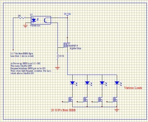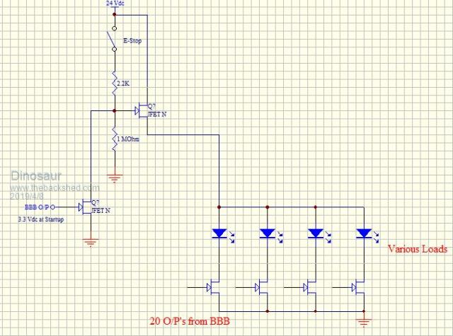 Taking advantage of the fact that the outputs are at 3.3vdc , I use it to drive one Fet to pull the other one Off. As soon as the BBB has powered up, and I have initialised the outputs, the 24 VDC rail will be allowed through to the 20 O/P's.
