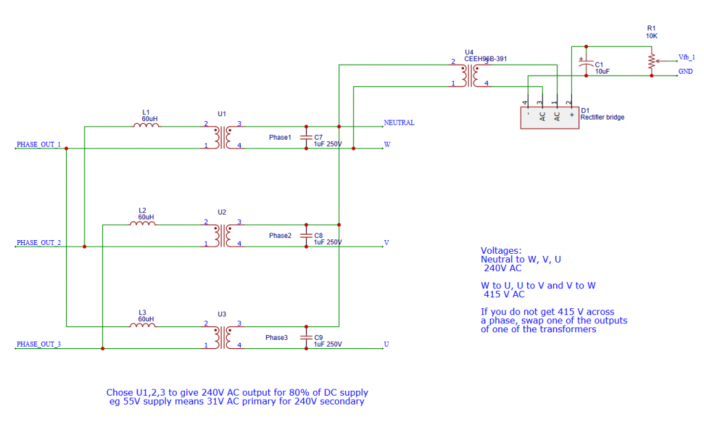 PWM signals are produced by a STM32F401 micro 3.3V supply is taken from the Black Pill module The 60uH and 1uF filter combo is likely to be changed in future HLK-PM15 are isolated 15V supplies that work down below 45V We could use one only for the 3 LOW side legs of the 3 half bridges but Haxby built the board to use one for each. 3 x half bridge drives 3 x transformers 3 x Vfb wronger than a phone book full of wrong phone numbers |