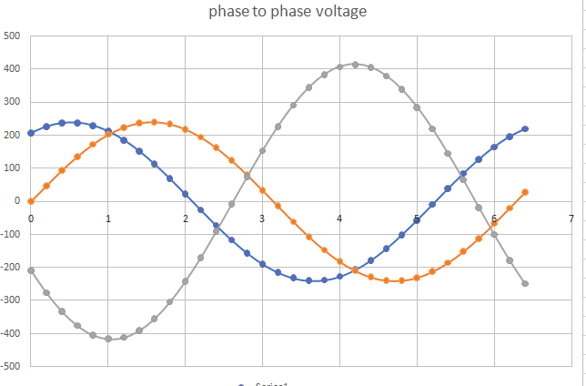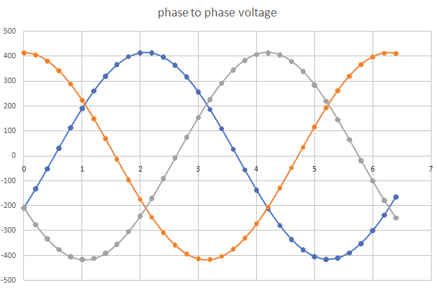 This might help you work out the wiring of the delta wired priamaries It's easy to get it wrong and you only get 240V phase to phase and not 415V All you need to do is swap the phase's primary 180 degrees. Here is a properly wired 3 phase waveform: the single phase voltages measured with respect to some common voltage (the neutral in a star connection maybe) and the phase to phase voltages now, I alter the timing of the Orange phase by adding 180 degrees. This is as if I swapped the primary winding terminals. The 3 phases are now NOT evenly split apart by 120 degrees. and here are the phase to phase voltages wronger than a phone book full of wrong phone numbers |