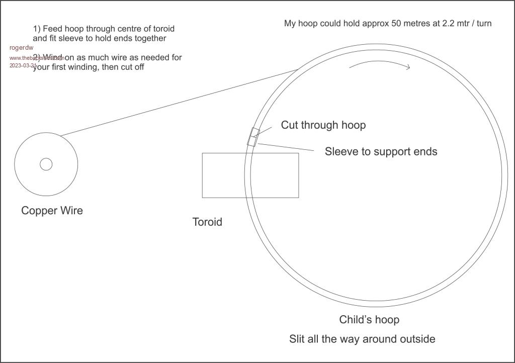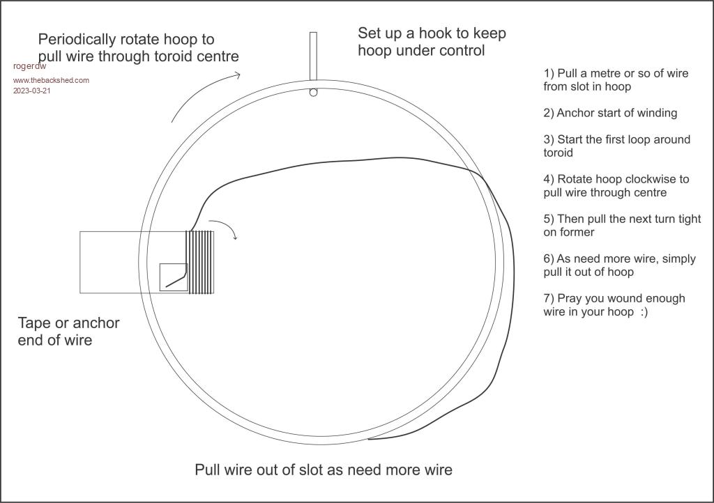 Excellent description and drawings there Roger. That should be clear enough for a first time toroid winder to grasp the technique. A stiff hula hoop type ring is best to trap the wire within but a slitted poly pipe (19mm) will do if hula hoops cannot be found. This will be very floppy until a few turns of wire are on it. With bicycle rims, being usually metal, there is the danger of the spoke holes scraping the wire already wound on the toroid, beside the open rim not trapping the wire on it securely. The main reason I chose this method over the spool or shuttle type is that it keeps your carefully straightened recycled wire straight. The more one straightens and then bends copper wire the stiffer it gets, the sharp turns of wire on a shuttle or (fit through toroid hole) spool negate any previous wire straightening and the result can be quite amateurish looking. |