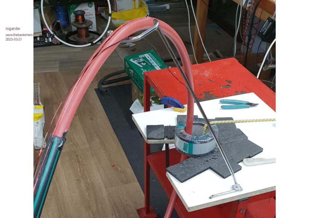 Hi Pete, I used the hoop method to wind the toroids. I found a child's hoop and cut a slot in the outer circumference using a Dremel, though a hacksaw would possibly have worked better. I then cut through the hoop so it can be fed through the hole in the toroid ... and made a sleeve to hold the ends together again, so it didn't flop around. Once the hoop was through the toroid centre, I wound the required length of wire onto the hoop. Then cut it off. Next step was to anchor the wire end to the toroid and start winding. It sounds complicated perhaps, but once you start it becomes a piece of cake. I created a hook to support the hoop so it didn't become difficult to handle. The hoop was quite stiff even with the slot in it ... so contained the wire well ... and it was easy to hold the wire in my left hand so it didn't come loose on the toroid ... and use my right hand to slide under the wire and round the hoop to pull a bit more out. When I needed a break, I would clamp the wire against the toroid with a large plastic spring clamp like an oversized clothes peg and it would remain nice and tight. Anyway, check out the diagram and pictures and if you have any more questions, yell out. ![]() ![]() ![]() Cheers, Roger |