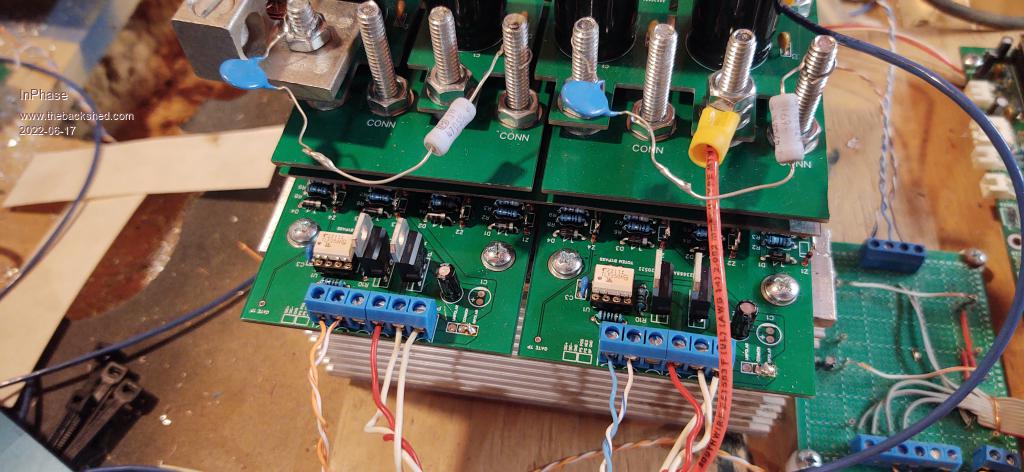 I solved my blow up problem from the thread "MOSFETS and Motors". Turns out that the slight differences in timing between opto FET drivers makes it a bad idea to try and use them in parallel. I went back to the drawing board and pulled out my old prototype and designed a PCB to carry four parallel FETs fed from a totem pole transistor pair, driven by an opto driver. I also made an overkill isolated bipolar FET power supply board. It gives me +12V and -5V for gate drive. Also, each power supply feeds a PC817 optocoupler. The outputs are in series with the nano switch so that if any supply fails, it locks the nano off. Seems to work good so far. I've reached the limit of the DC supply I use to test in place of batteries, about 1 kW. Here's some pics. Ignore the jumbled up mess of wires