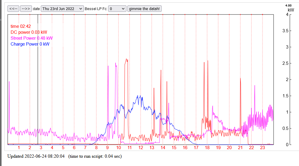 here is yesterday's data showing street power, inverter DC input power (10% more than it's output) and charge power. We can see the battery charge enough for the inv to start up. Then it runs until the battery LV cutoff limit occurs.