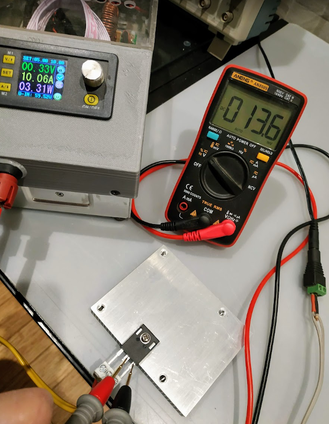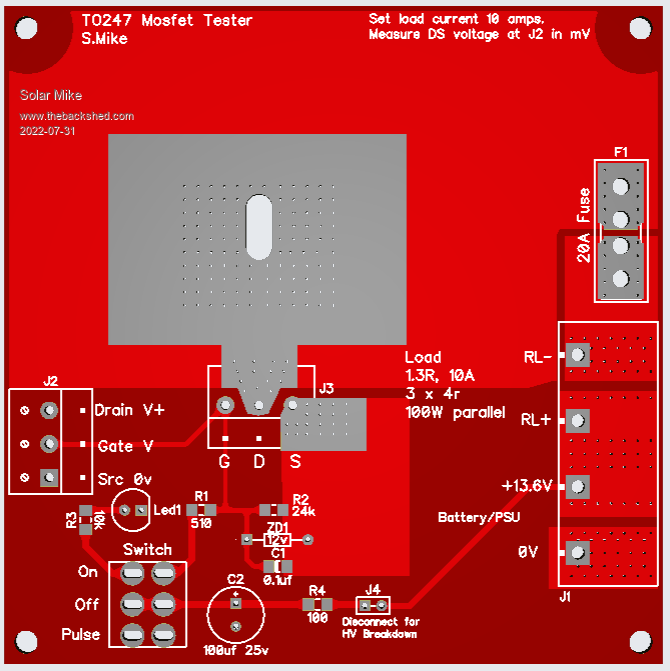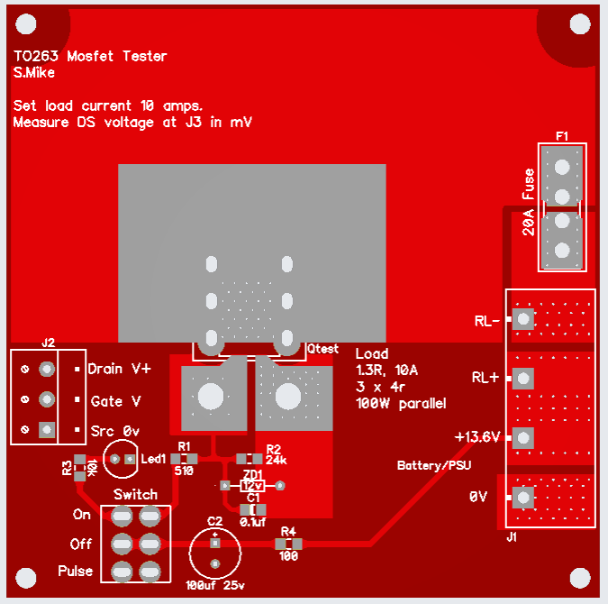 A 12 volt variable PSU will be used to power it and 3 x 4r 100W metal shell resistors in parallel as a load. If I use 10 amps as the load, then its easy to convert the mV drop across the Drain-Source pins to ohms. Mount the pcb on an alloy heatsink with the power resistors, may need a small 12v fan, will see.