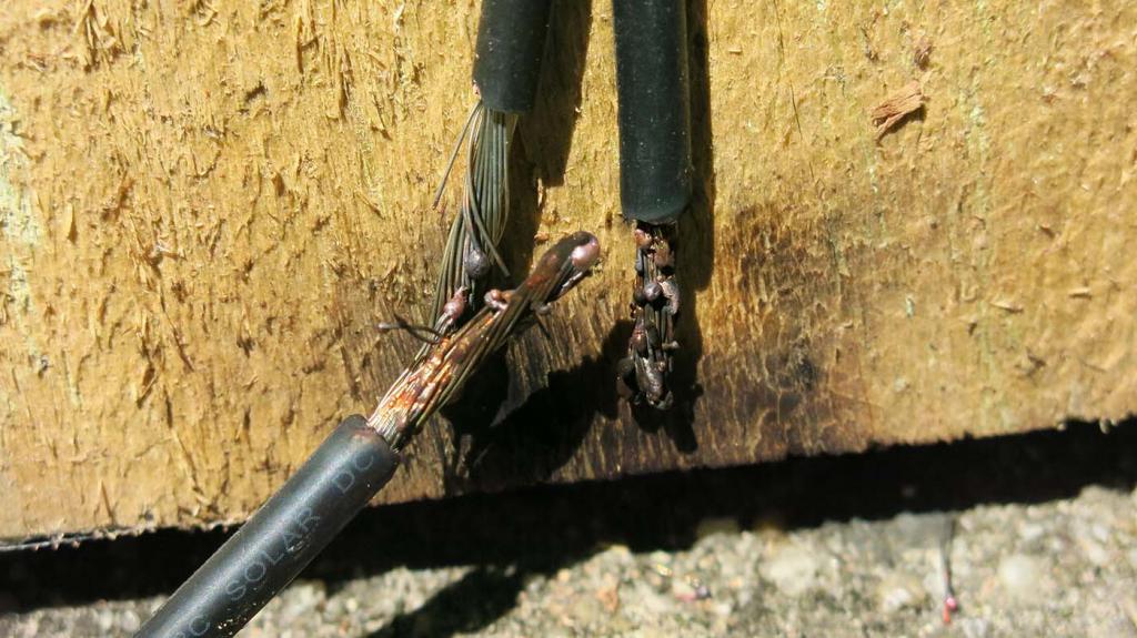 I took a pair of "4 Amp" solar twin core cable out from the isolator/CB, ran the twin core down a bit of timber and bared 1cm at the ends of each. I wanted these ends to remain close so as to help maintain the arc.