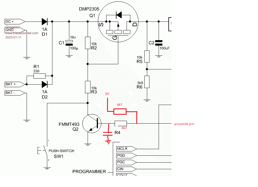 MY solution with more detail ![]() Add resistor to 5V the same value as R4 - 4k7 looks good choice. Add small capacitor across transistor. No other hardware changes needed. On the picomite, the pin powers up as input = high impedance so transistor switches on almost immediately. Voltage on input pin is under 3V so no problems there. To shut down, change pin to output and set low. It will stay low until picomite runs out of puff. Jim VK7JH MMedit |