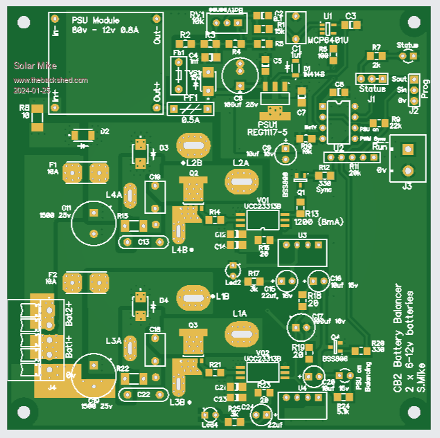 CPU Picaxe 08M2 starts balancing when total battery voltage reaches a set point, turns on power to the two 12-12-1W psu's than ramps up pwm to 48% duty.
