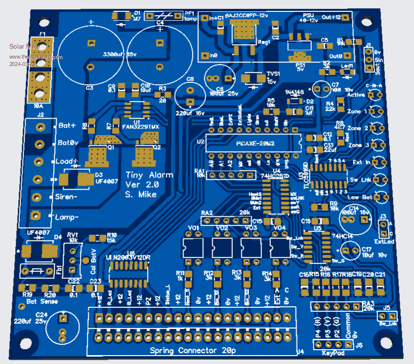 Have made a small alarm board with outputs for a siren and Led Strobe lamp + led lights. Inputs for thermal sensor, and two point to point beam sensors + wire trip sensors. Will install this in a covert location, anyone going near the panels will create a lot of action.