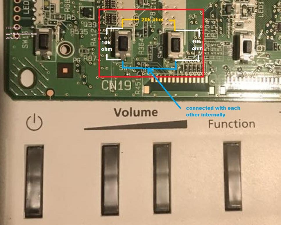 when i measure the ohms between the two other pins from each push button I measure 20K