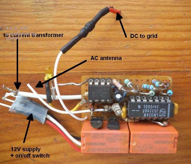 Now I am living in a bigger house, whith 2 panels summing 340W. The house grid now beeing too large to pass 12V DC without excessive resistive losses, I decided to use it with AC, which is also much more universal. But just having the inverter idling most of the time is a big energy waste, especially with little installations and bigger inverters.