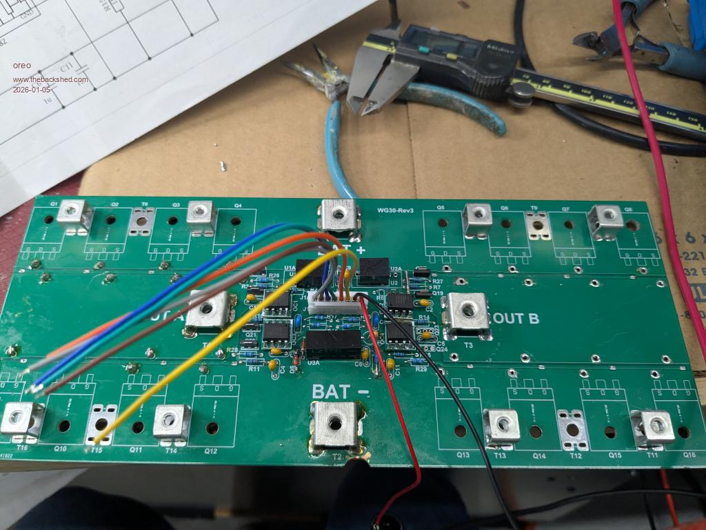 So now the top of the battery was clear, however I had added items onto the battery in a hodge podge manner and had wires entering the battery on 3 sides. So I took to opportunity to improve this by both increasing wire sizes and moving all entry into the box to the rear of the battery on a separate panel. I also changed out the couloumeter to a Junctek KM110F which has wireless, so I can view the battery condition anywhere. This is what it looks like now. ![]() Everything seemed to be working well, and I was getting ready to install 6 more battery packs on the top of my battery, when the inverter popped. I was in the basement at the time, and there was no change in noise level or anything, just the breakers on the batteries and inverter tripped. It was in the middle of the day, so there would not have been much of a load on the inverter. In testing I can only find that Q5-Q8 and Q13-Q16 have failed. The little power supplies and driver transistors are ok. I am thinking of using my back up board as replacement rather than fixing this one.. I can't see any other issues at this point. Thoughts on what else to check? ![]() thanks Greg |