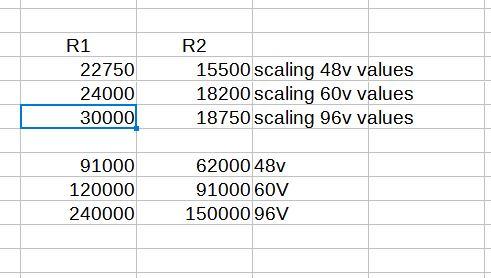 I have egs002 based inverter board. It specifies resistor values for 48V, 60V and 96V. I want to change it to support 12V. How do I find the resistor values. Tries to check random values but not successful.
