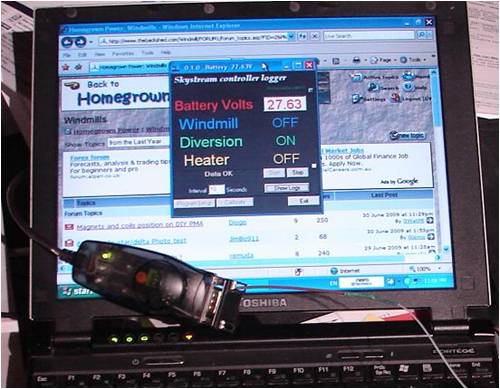 The Belkin interface is resting on the keyboard, and the display window shows the battery voltage and the status of the windmill controller.
