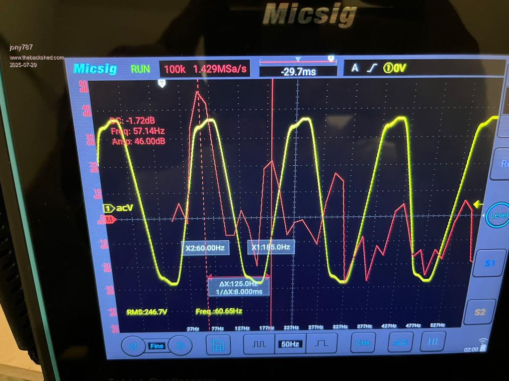 "Group 3: Monitors change of impedance." It depends on how they do that. One possible method would be with a significant current pulse and measure the resulting delta V. Impedance = delta V / delta I. That could produce the regular notch you see. If your scope has 2 channels put a shunt in the line and connect a probe to each side and switch on a large load. Align the traces and read the difference between them before, during and after the notch. If there is a current pulse the middle one will be noticeably different to the others. The shunt resistance will need to be large enough to show the difference on that voltage range. Eg 1Ω would make a 10A pulse produce a difference of 10V and clearly visible. If the pulse is only 1A a higher value will be needed. For a single channel scope I guess careful measurements of those 3 points taken on both sides of the shunt then subtract the pairs of measurements. May not be as accurate but might still work. Edited 2025-06-19 10:23 by phil99 |