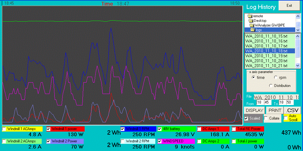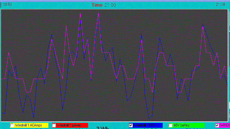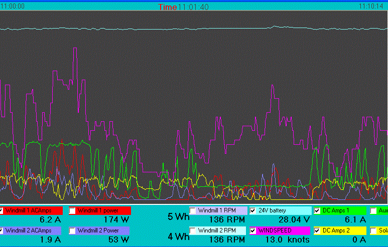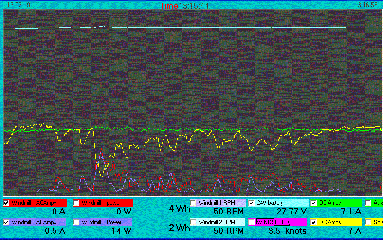 The Yellow is Solar RE 24VDC current the Green is GTI export 24VDC current the Red is newer AxFx windmill 24VDC current the Blue is control AxFx windmill 24VDC current the Lt Blue is the battery voltage the Purple is the windspeed The cyclic loading of the PowerJack GTI is evident, and OFF periods that occur with normal operation of the Outback MPPT. The windmills just do their thing. At low surplus power levels, the powerjack did stay connected with 1.4A. The outback was OFF during this time, and the windmills were providing varying currents. There seems to be a low threshold current to maintain a GTI connection. I still have to add more solar to the mix, and storm events will still need to be monitored for the windmills. This is to check the maximum power handling of the GTI. In the event of mains failure, the GTI will be OFF, and the windmills will shut down at a preset 29.5V. Until then the windmills and solar will alternate to supply just enough power to the static loads. If there is a lot of surplus, then the solar and windmills will shut down. I will maintain the logging until all these conditions have been monitored. Gordon. become more energy aware |