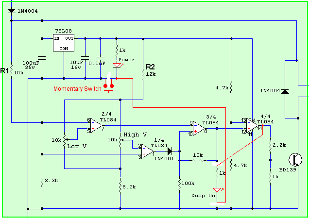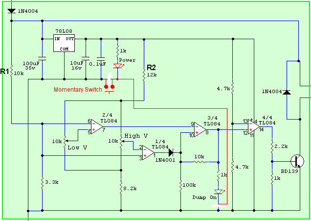 I am a new user of wind/solar power and I love DIY projects. I have been 'lurking' around this site for a while, and decided to build thet TL084 charge controller. It works great! However, since I have the controller in a one room cabin and the LED's are quite bright at night in this remote location, I was wondering if anyone could tell me if there is a way to change the wiring so that the LEDs operate on a push button.