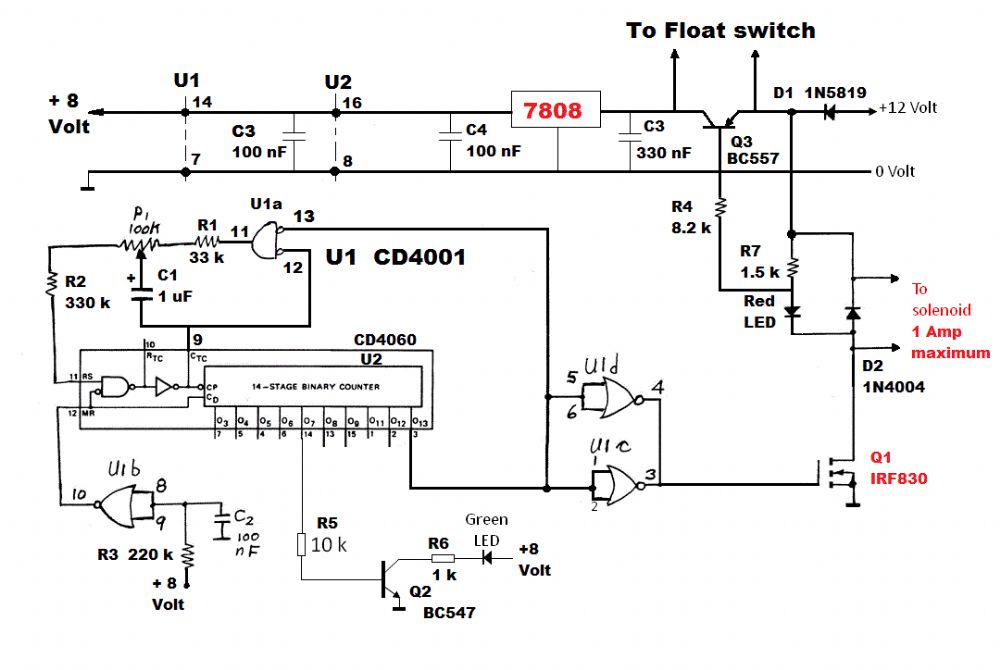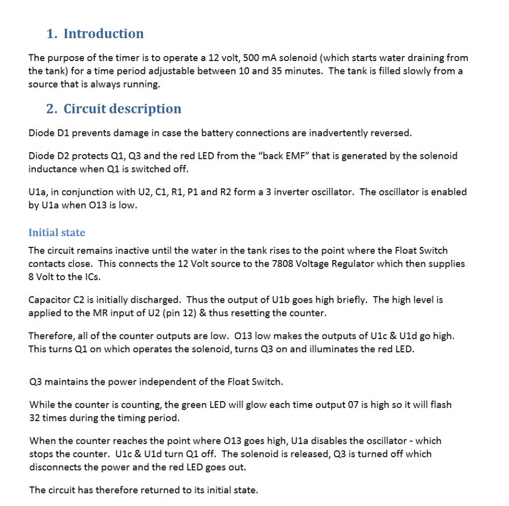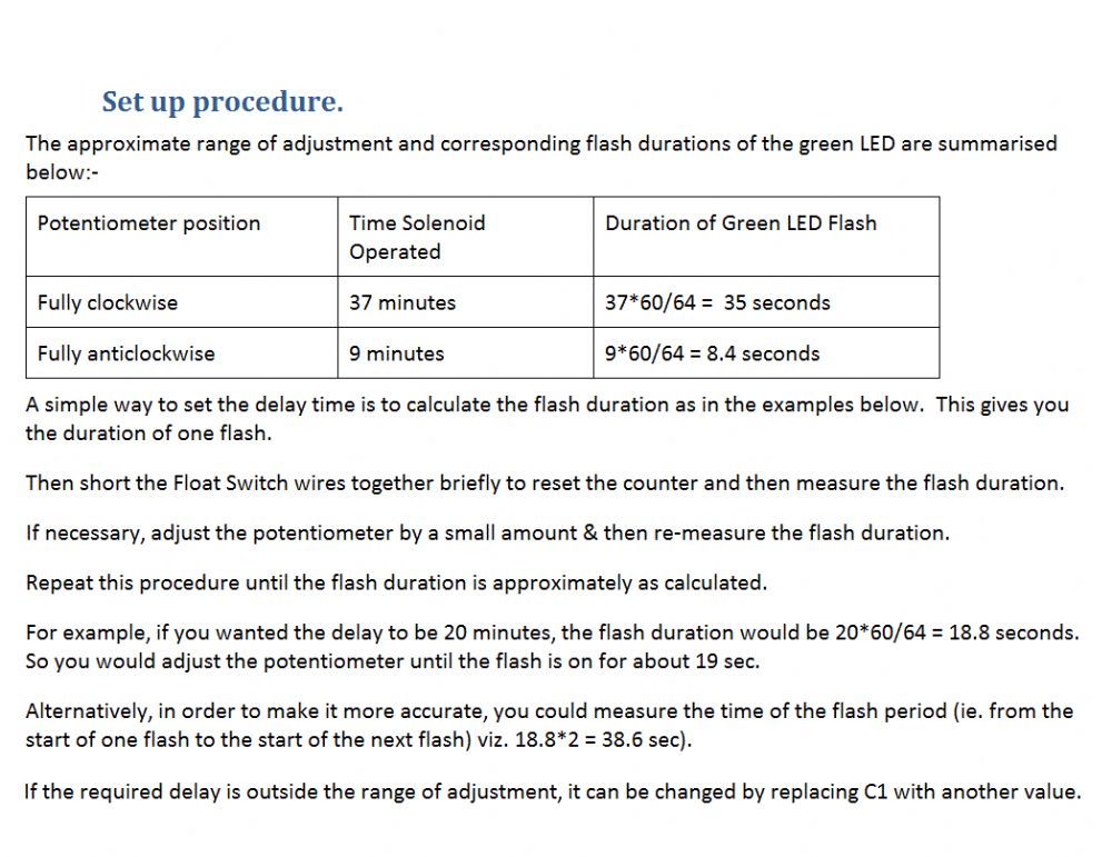2. the timer operates a solenoid valve for a time that is adjustable (by a potentiometer) from 2 minutes to 20 minutes approx.