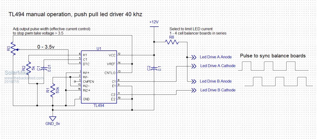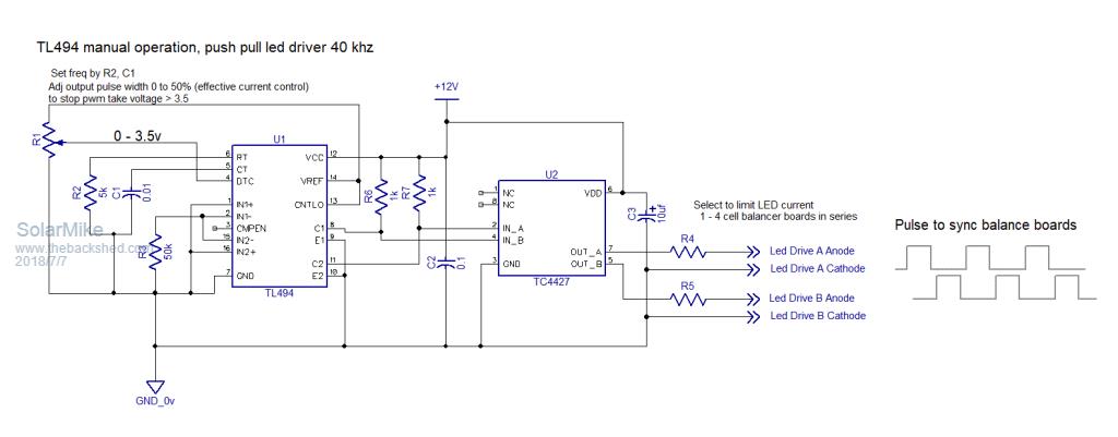 Klaus I am sorry if the circuit intimidates you - for me its easy....... & I hate mechanical clicky things. I think I will create a PCB for an application that could also suit you that will look after 8 cells per PCB as I am sure I will be needing & using some myself. I Would be happy to give you a couple of boards for evaluation when finished & tested - if you are interested/game. SolarMike, Please note my previous post & intention to use a totem pole output single chip solution. I ran out of time earlier today to create & present my solution for the master driver. In retrospect it was probably a mistake to even mention your TL494 circuit. ![]() The 3808 has 500mA source and 1A sink. Each Opto can work happily from 1.5mA source current. We could drive a couple of hundred if we had to from the one master. I do not advocate driving any optos in series, I would stick to only parallel for this application. I am not certain whether Pin3 (CS) works best at GND or tied to the clock pin, I seem to remember an issue in the past - will tell you after I lash one up again. Would be happy & interested to see your suggested circuit to "use a self driven ringing choke inverter and isolated output winding + diode to feed current into the whole bank; with start control via a cheap opto-coupler, no driver required; would simplify everything". I'm not even sure I actually understand/follow the topology of what you are proposing & how the individual cells would track evenly. If at first you dont succeed, I suggest you avoid sky diving.... Cheers Mike |