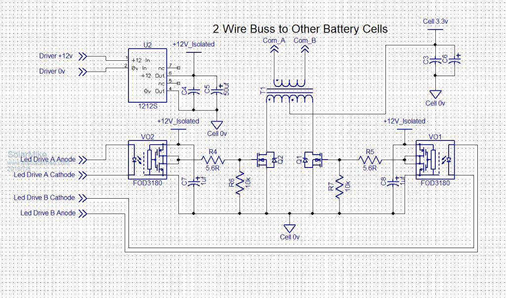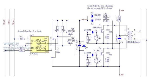 I really like the idea of variable duty cycle, that is something I had never considered. Opto isolator drive as you are suggesting will have fewer problems and be much easier to get going than pulse transformers. For the gate drive dc supply, how about a Maxim MAX630 running off the cell voltage? https://pdf1.alldatasheet.com/datasheet-pdf/view/73626/MAXIM/MAX630.html That would reduce the required external wiring slightly. The whole idea Wiseguy has proposed is a very intriguing idea, which has opened up a great many possibilities. Cheers, Tony. |