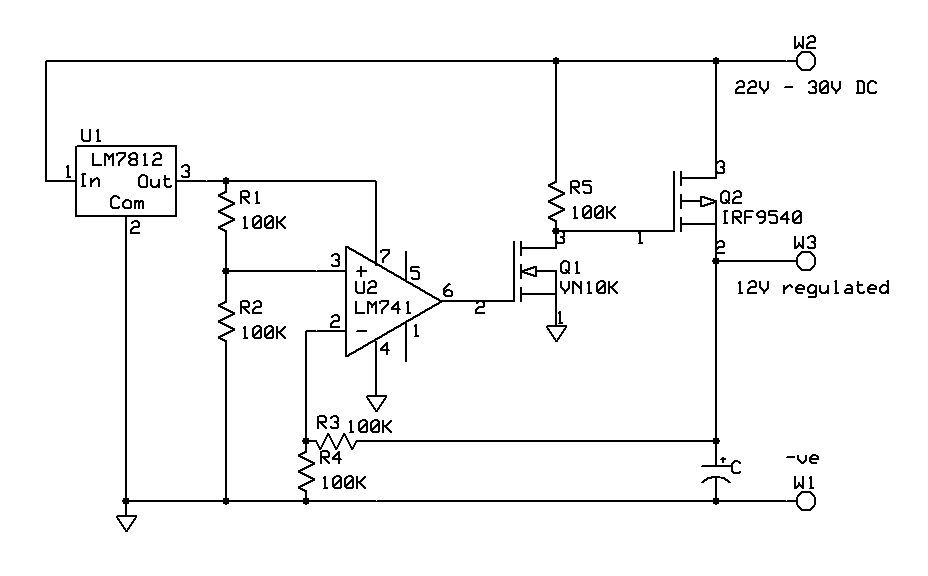 I run 24V, but sometime would like to run 12V appliances, so I designed this circuit. I am a bit of a newbie to electronics, so comments and suggestions would be most welcome. South Easter