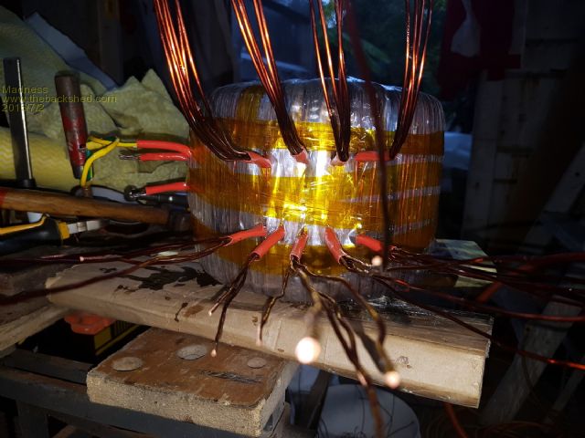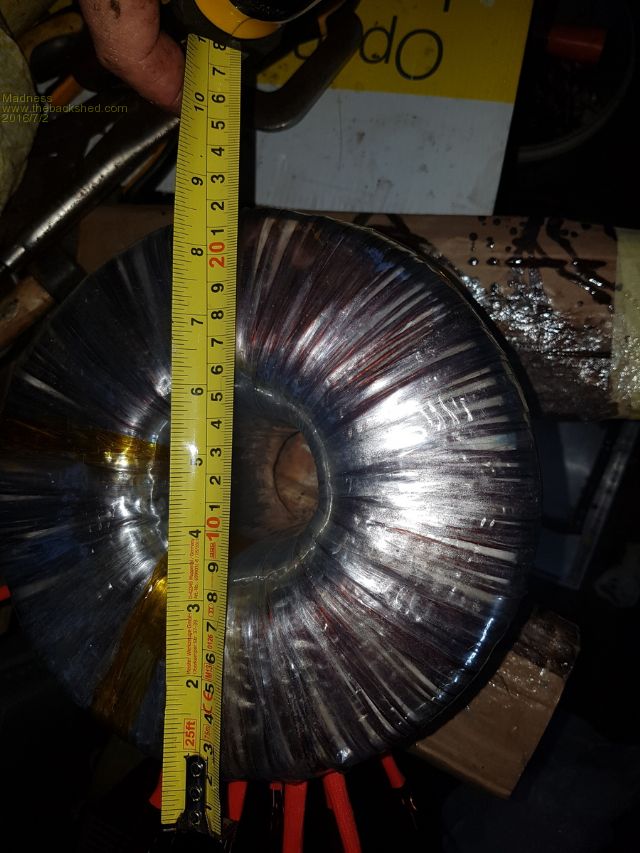I got 21 x 2 mm wire so total of 66 mm square on the primary. Ended up with 2 and a bit layers of wire on the inside and 1 layer on outside. If anyone plans to copy what I have done, pay a lot of attention to getting the wires spaced out very evenly. They are not so easy to move around when you have 8 or 9 wires on there and the spacing is out. The paper guide I made on CAD software and put under the Mylar is a big help here. Secondary is 4 X 1.6 mm so total of 8 mm square. I think it would be possible to add 1 or 2 more on the secondary and still maintain the same ratio for the primary. But as you mentioned Oz, fingers are still and sore, my crook shoulder is aching and my back is stiff. (Wife thinks I have lost the plot also)