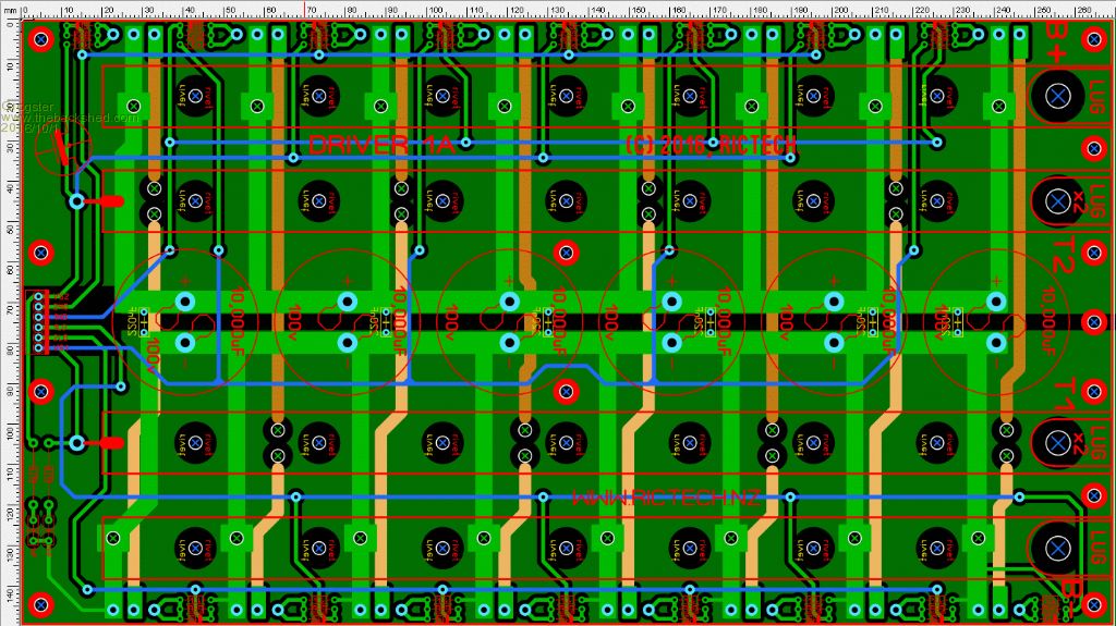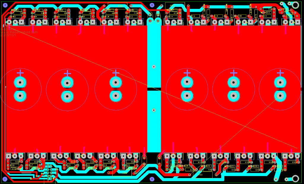 Keep in mind that the original design which mine above essentially is, uses the heat sinks as conductors for DC + in and on the bottom side of the image above the heat sink is split in 2 for the output to the Toroid. This reduces greatly how much current needs to flow through the PCB.