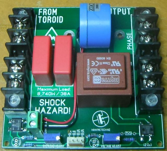 Note that in these photos, I have not fitted the 7k5 resistors for the voltage feeback as I don't have any of that particular value, and also the thick wire for the phase through the C/T is not installed - perhaps tomorrow.