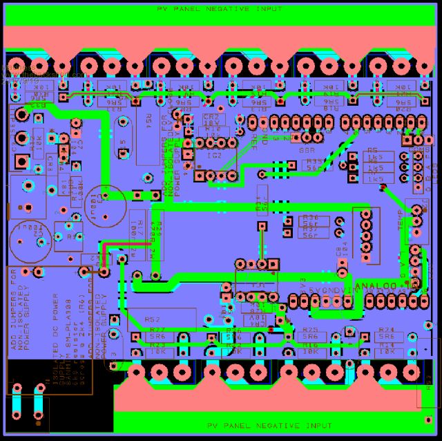 First board will run 1 or 2 GTI's or straight PWM PV to battery, the slave board could run another 2 GTI's or another 12 MOSFETs. My plan is to run one 5KW GTI and use the remaining 18 MOSFETs to control PWM PV to battery. I don't know the upper limit but HY4008 FETs are rated at 200A, even at 10% of that 18 of them would handle 18KW of PV on a 48V system.